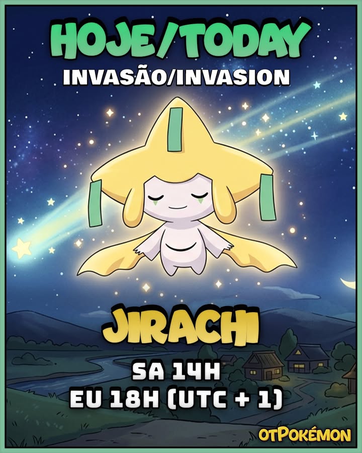 Um dos Pokémon mais raros está prestes a aparecer! Jirachi realizará uma invasão especial hoje, oferecendo uma grande oportunidade para os treinadores que estiverem preparados.